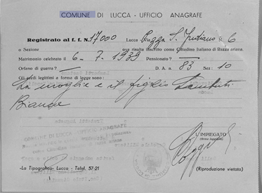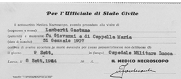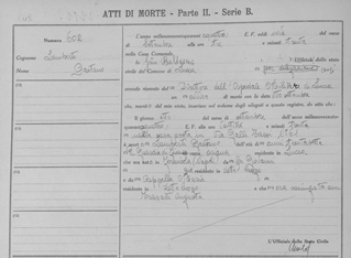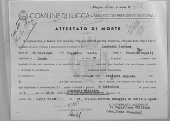 Il primo Sindaco di Lucca Gino Baldassari lo inserisce “per delegazione” nel registro dei Morti parte II Serie B, avendo ricevuto l’avviso di morte in data 8 settembre, redatto dal cappellano Militare Sac. Italo Giannini e successivamente convalidato dal medico Necroscopo.