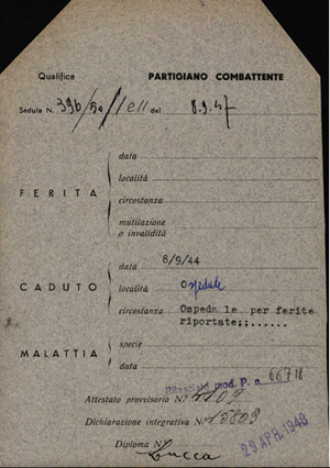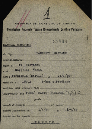 La Presidenza del Consiglio dei Ministri – Commissione Regionale Toscana Riconoscimento Qualifica Partigiano lo registra nella seduta dell’8 settembre del 1947 al nr 38898, periodo dal 1/5/44 al 8/9/44 come inquadrato nella Formazione BONACCHI, che opera a Lucca sotto il controllo del C.L.N.