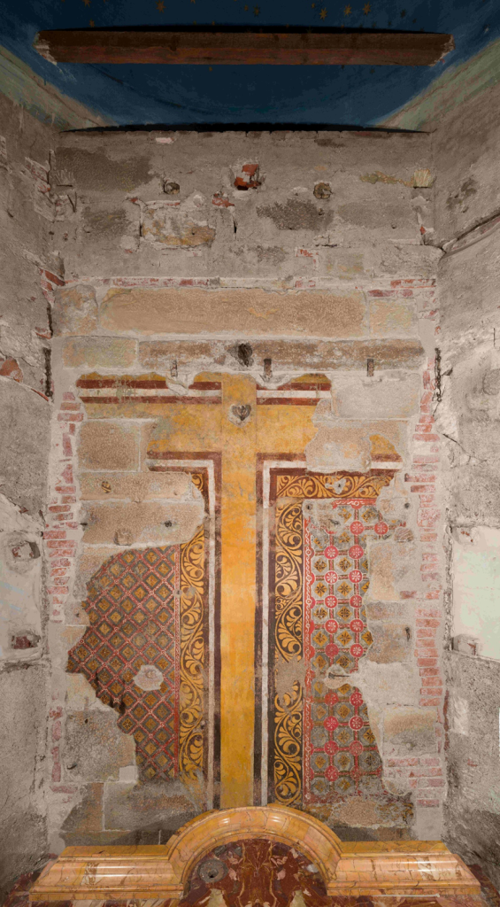 Liberata la parete di fondo sono, infatti, emersi i resti di una pittura murale, di cui non si conosceva l’esistenza, compromessa da un consistente deposito di polveri e materiali sedimentati. Grazie al restauro è adesso visibile una croce dipinta di colore ocra, realizzata ad affresco con finiture a secco, incorniciata da motivi vegetali di colore giallo-marroni e da una decorazione asimmetrica riconducibile a pattern tipici della produzione lucchese della seta nel Medioevo. Cronologicamente anteriore alla costruzione del tempietto del Civitali, la croce dipinta era concepita come fondale del Volto Santo e ha dimensioni compatibili con quella di legno del crocifisso.