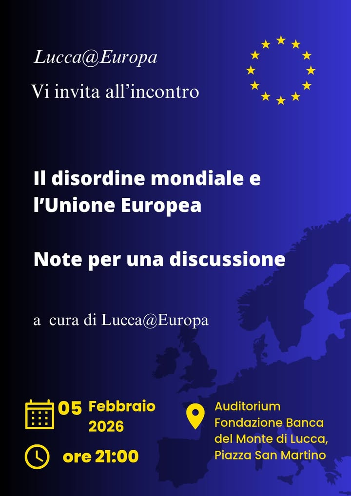 Ripartono le iniziative di Lucca@Europa, che invita i cittadini all’incontro pubblico in programma giovedì (5 febbraio) alle 21 nell’auditorium della Fondazione Banca del Monte di Lucca (Piazza San Martino, 7): sarà presentata la pubblicazione curata dal gruppo d’impegno civico dal titolo “Il disordine mondiale e l’Unione Europea. Note per una discussione”.