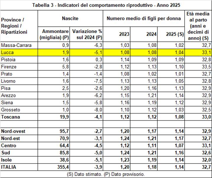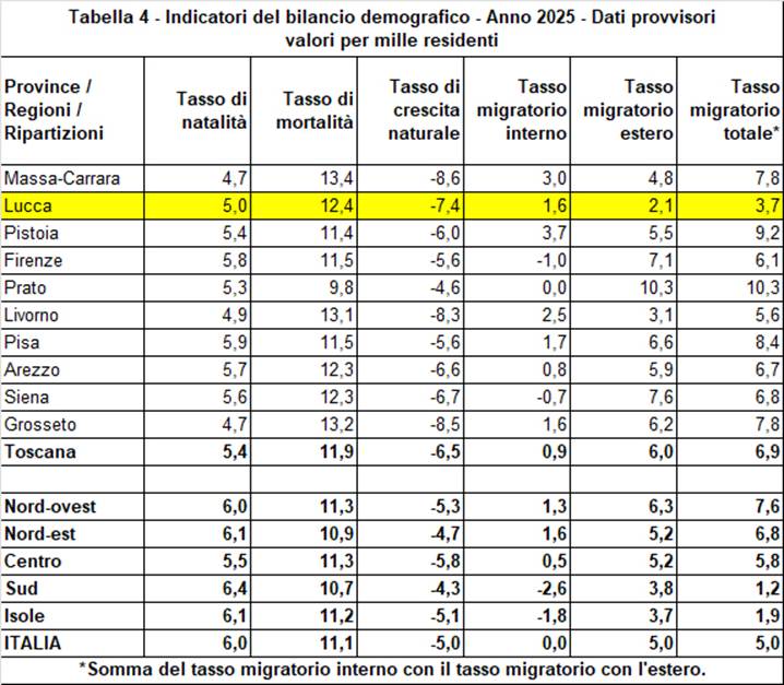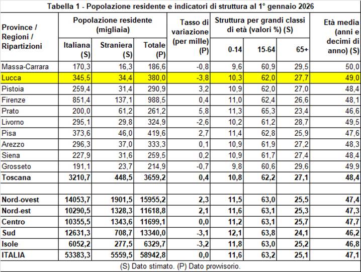 Vediamo il dettaglio nazionale fornito dall’Istat e integrato con quattro tabelle che evidenziano la situazione della provincia di Lucca in Toscana e in rapporto alle varie aree (nord-ovest, nord-est, centro, sud e isole) italiane.