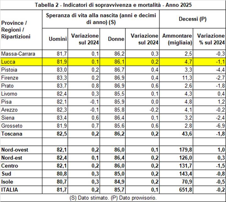 A livello regionale è il Trentino-Alto Adige la regione in cui si vive più a lungo, con 82,8 anni per i maschi e 86,8 per le femmine. In fondo alla graduatoria continua a collocarsi la Campania con, rispettivamente, 80,1 e 84,1 anni, regione che tuttavia evidenzia incrementi importanti almeno tra gli uomini rispetto al 2024 (3 decimi in più, 1 decimo per le donne).