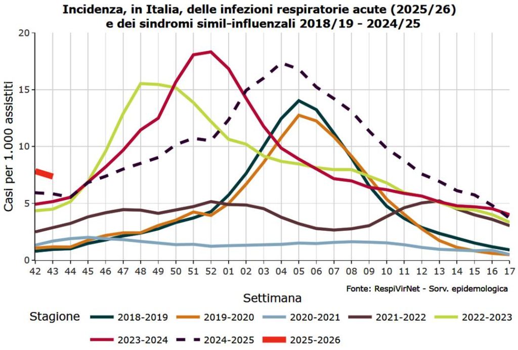 Mancano ancora 53 giorni al Natale e sono già arrivati quelli che, tradizionalmente, sono i regali meno graditi delle feste: l’influenza e i virus respiratori. Venerdì scorso, 31 ottobre è stato diffuso il primo rapporto stagionale, relativo alla settimana numero 43 del 2025: quella che va dal 20 ottobre al 26 ottobre.