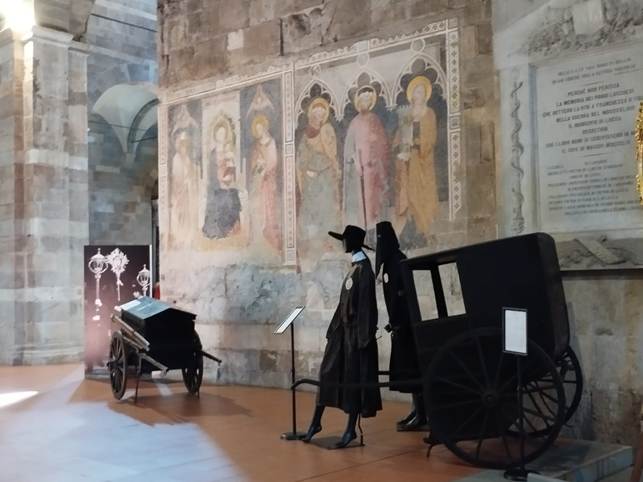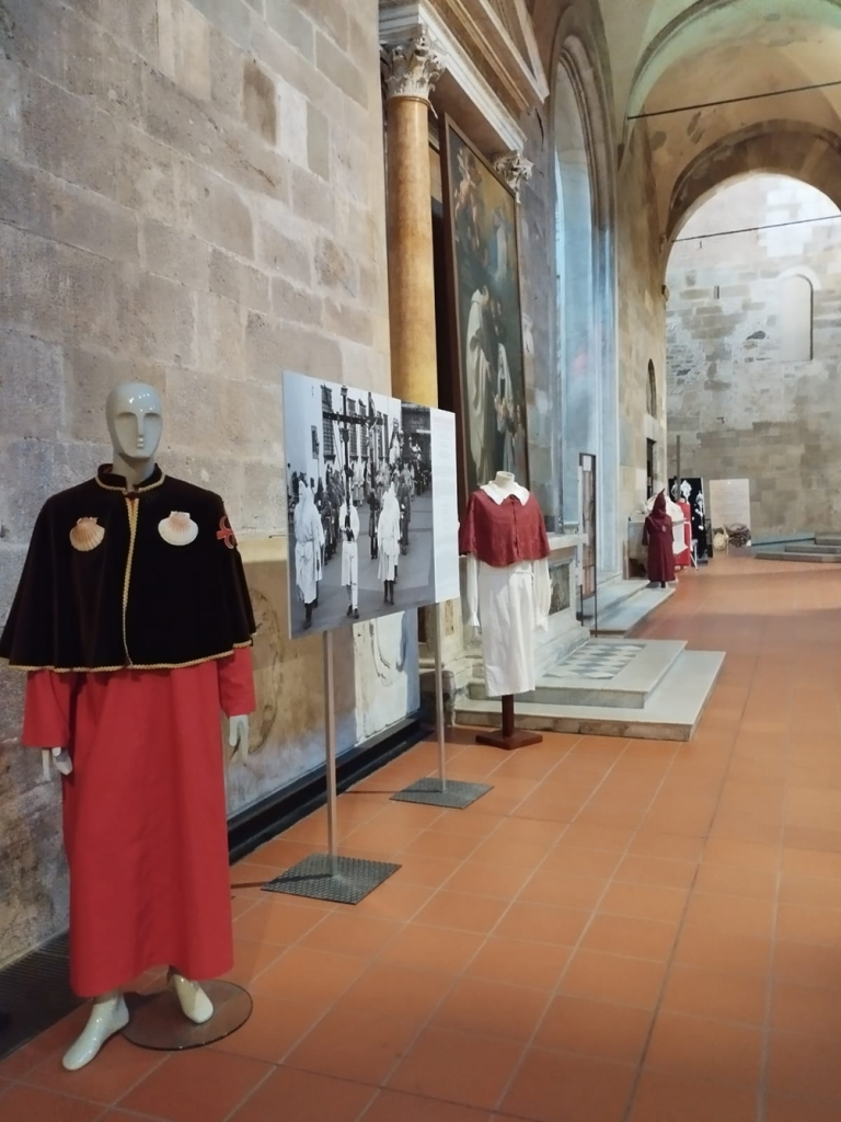 «Per comprendere il significato di tutto questo – hanno spiegato i promotori – è interessante proprio seguire l’itineranza della mostra che è partita da Pisa, presso il Museo della Grafica (Palazzo Lanfranchi) il 9 maggio 2025 per concludersi il 20 giugno scorso per poi traferirsi a Lucca dove resterà fino al 25 ottobre (aperta tutti i giorni 10.00-18.00; ingresso gratuito per i gruppi confraternali, non per i singoli), quando sarà trasferita a Lugano presso Villa Ciani dal 7 al 23 novembre 2025. Quest’itineranza geografica ha consentito di strutturare una mostra con contenuti diversificati che ogni volta, nelle rispettive sedi, si rigenerano dando spazio alla valorizzazione dei patrimoni confraternali locali. Accanto alle vesti sono esposti anche oggetti connessi alle attività proprie delle confraternite, gli antichi statuti, stampe e altri documenti d’archivio rilevanti per comprendere in modo dettagliato il significato di questo mondo. In particolare la presenza di numerose Confraternite nell’Arcidiocesi di Lucca trova un riscontro anche per il ruolo fondamentale che questa città ha nella storia del pellegrinaggio europeo. Infatti, fin dal Medioevo, la città è stata una tappa chiave lungo la Via Francigena, il cammino che collega Canterbury a Roma per poi proseguire verso la Terra Santa. La sua privilegiata posizione geografica ha favorito secoli di scambi culturali, religiosi e artistici e tutto questo trova chiara espressione nelle tradizioni confraternali attraverso il linguaggio del suo inestimabile e ricco patrimonio culturale religioso.
