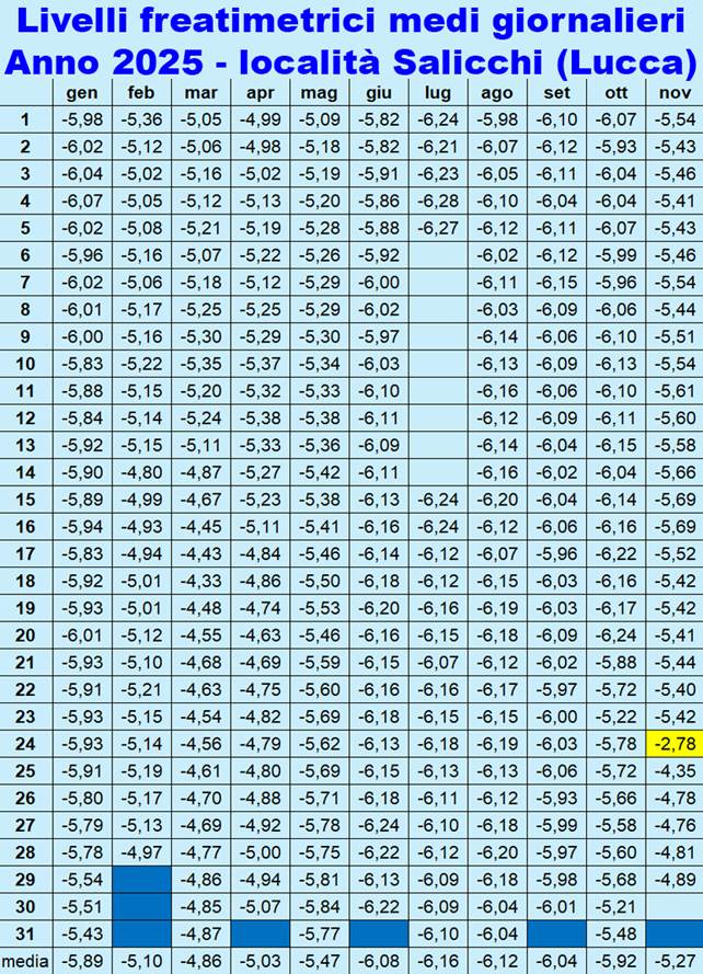 Nella tabella qui sopra si nota che il giorno 24 novembre, a seguito delle intense piogge, il livello freatimetrico a Salicchi, dove si trova il campo pozzi dell’acquedotto cittadino, è salito fino a raggiungere quota meno 2,78 metri rispetto al piano di campagna. Si tratta del valore più alto in assoluto da oltre 16 anni. Al secondo posto di questa classifica si trova il 23 gennaio 2021 con meno 3,26 metri, e al terzo posto il 16 novembre 2010 con meno 3,38 metri.