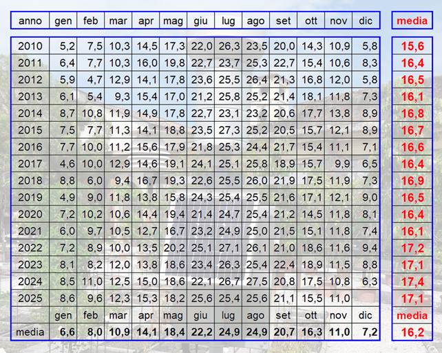 Da notare, sempre guardando la precedente tabella e in particolare la colonna “media”, quella con i valori in rosso, che dall’anno 2011 la temperatura media dei primi 11 mesi dell’anno (dal primo gennaio al 30 novembre) è sempre stata superiore a 16 gradi; con 9 anni sopra la media storica (che è di 16,2 gradi C) e soltanto due anni con una media appena inferiore alla media storica (il 2013 e il 2021 con una media di 16,1 gradi). Negli ultimi quattro anni, ovvero dal 2022 a oggi, la media dei primi undici mesi è stata superiore a 17 gradi C, con la punta dello scorso anno quando si arrivò a 17,4 gradi C.